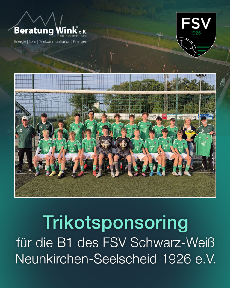 Pünktlich zum Saisonstart durfte sich die B1 des FSV Schwarz-Weiß Neunkirchen-Seelscheid 1926 e.V. über brandneue Trikots freuen – gesponsert von uns. Bei der offiziellen Übergabe hatten wir die Gelegenheit, mit dem Team und dem Trainer ein bisschen zu plaudern – die Vorfreude auf die kommenden Spiele ist riesig! Wir sind ...